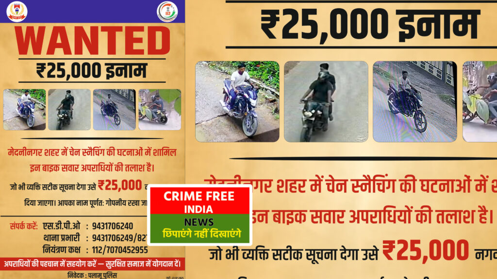 WANTED पोस्टर जारी किया गया है, जिसमें चेन स्नेचिंग में संलिप्त अज्ञात बाइक सवार अपराधियों की जानकारी देने वालों के लिए ₹25,000 की नगद इनामी राशि की घोषणा की गई है।